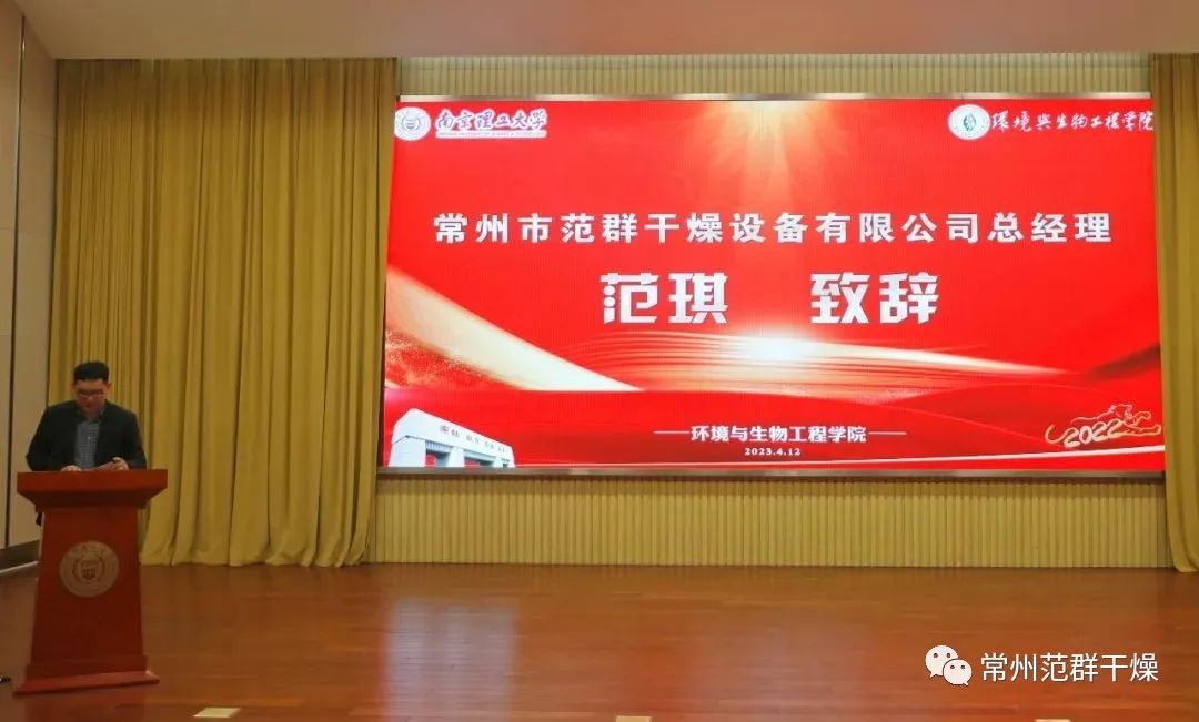 4月12日下午, 南京理工大學(xué)環(huán)生學(xué)院環(huán)境與生物工程學(xué)院舉行2022年度社會獎學(xué)金頒獎典禮暨優(yōu)秀學(xué)生報(bào)告會。南京理工大學(xué)博士研究生、常州市范群干燥設(shè)備有限公司總經(jīng)理、江蘇南理范群裝備科技有限公司總經(jīng)理范琪博士應(yīng)邀出席并作為企業(yè)代表發(fā)言。